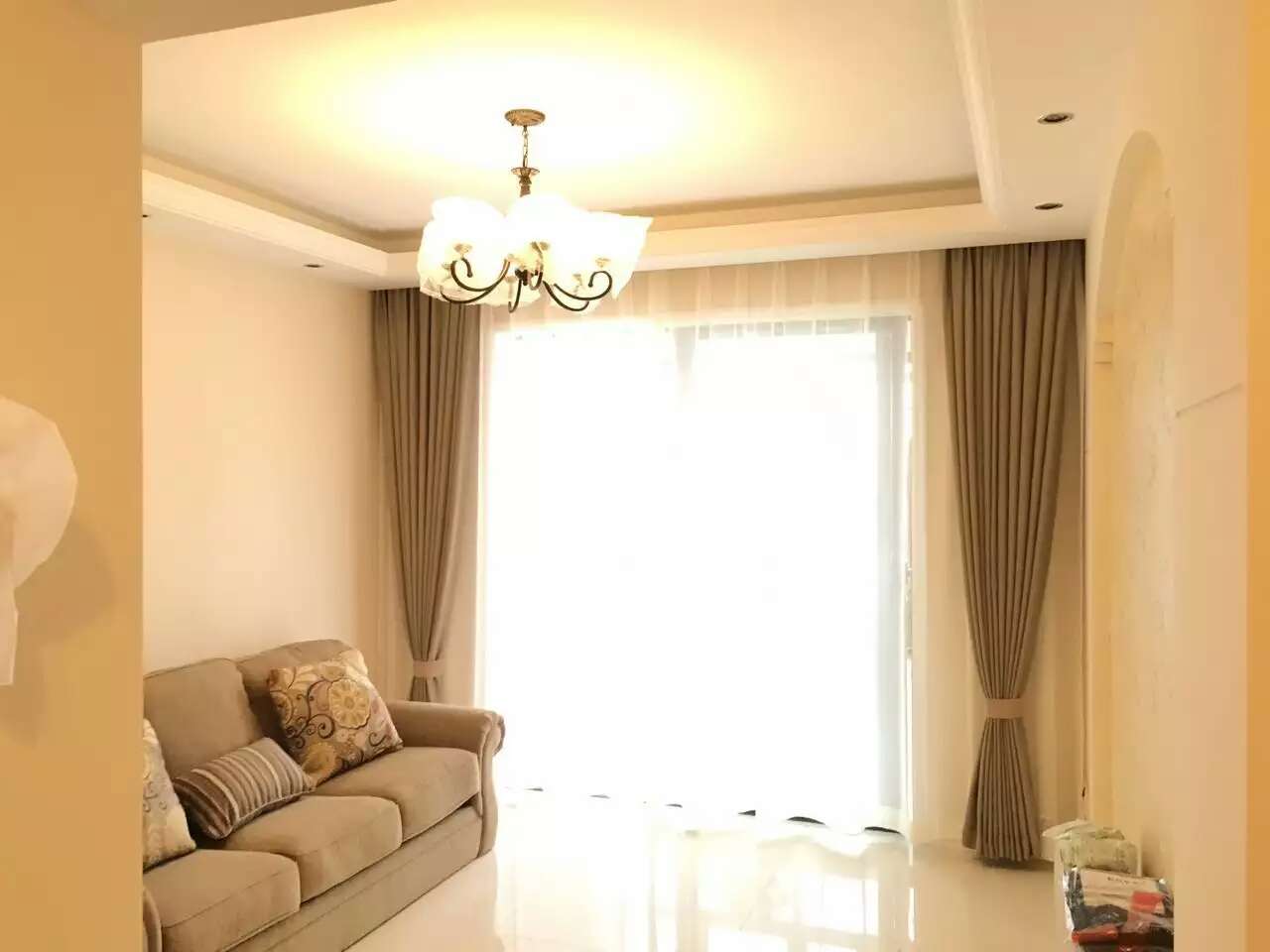 图片中是为荔苑小区的业主设计的纯色亚麻窗帘,也更好的搭配了业主的沙发颜色,纯色亚麻窗帘加上一层白纱,看起来简直就像在仙境啊,这样的窗帘设计您说豪不豪华?